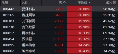 周五(2月21日),AI主线行情继续演绎,算力概念爆发涨停潮,液冷、算力租赁、数据中心、云服务等均有亮眼表现。创业板人工智能指数豪涨6%再创历史新高,润泽科技、锐捷网络、光环新网、奥飞数据集体20CM涨停,网宿科技、深信服、铜牛信息、神州泰岳等跟涨超10%。